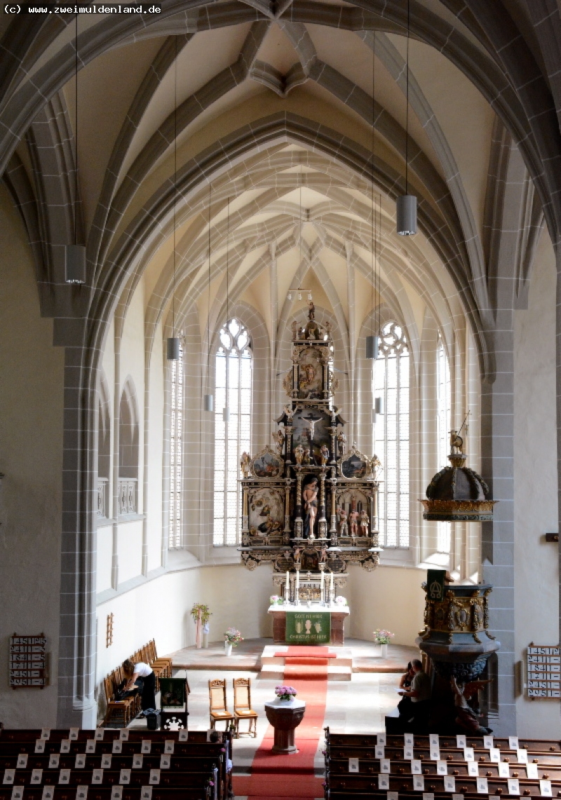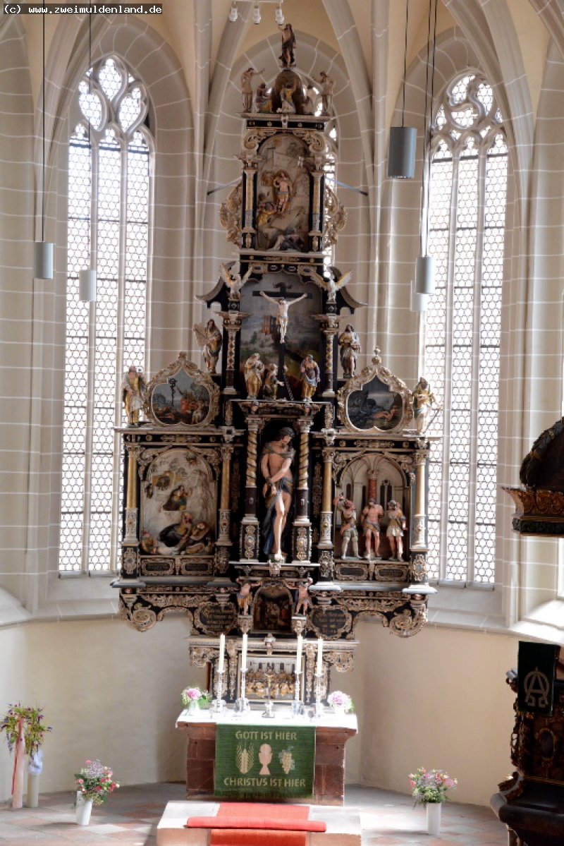 Zwischen Markt und Burg Mildenstein steht in Leisnig die alte Stadtkirche St. Matthäi. Urkundlich wurde sie 1293 erstmals erwähnt. Wesentliche Bauarbeiten fanden im 15. Jahrhundert statt. 1636 geriet sie in Brand, der Wiederaufbau dauerte 10 Jahre. Der Turm wurde erst 50 Jahre später fertig. Heute präsentiert sie sich uns als dreischiffige Hallenkirche im spätgotischen Baustil. Im dreiteiligen Altar wird die komplette Leidensgeschichte Christis dargestellt. Er entstammt 1663 / 64 Otto und Johannes Richter, die Predella zeigt das Abendmahl. Im Altar sind auch die wichtigsten Persönlichkeiten des Christentums platziert.